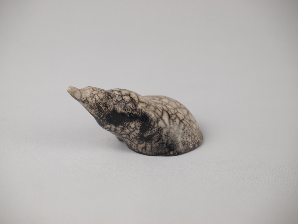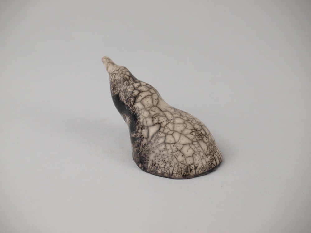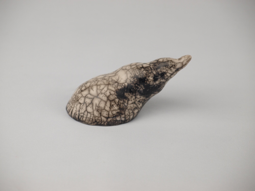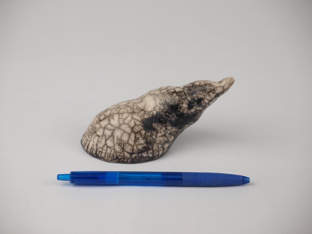 Caracola modelada en arcilla refractaria. Acabada con la técnica del rakú desnudo, que le confiere los blancos y negros característicos.